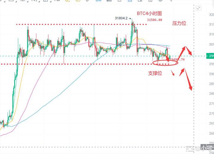 日线级别昨日收出倒锤线,布林带平行运行,受布林下轨29500支撑,4小时级别布林带平行运行,受布林中轨30000压制。操作上建议回踩29500附近轻仓做多,目标29800-30100,上攻30500不破轻仓做空,目标30100-29600,止损各350点。行情变化万千,具体操作以实时策略为主。一颗红心做好两手准备嘉威KDJ四柒伍八零,浮竹提醒切记带好止损止盈