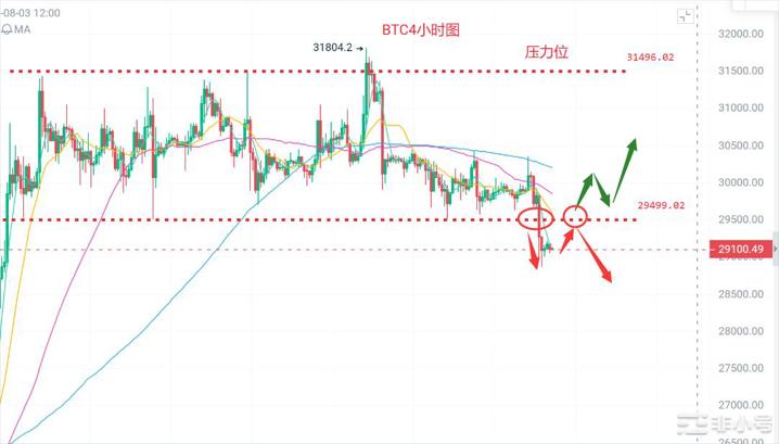 日线级别昨日收出阴线,布林带朝下运行,受布林中轨30000压制,4小时级别受MA120日线的压制,布林带开口打开,受布林下轨28900支撑。操作上建议回踩28500附近轻仓做多,目标28900-29300,上攻29800不破轻仓做空,目标29100-28400,若币价重回箱体内,则可依托29500一线布局多单,止损各350点。行情变化万千,具体操作以实时策略为主。