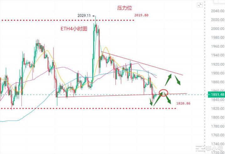 以太坊昨日高点1890附近,低点1833附近,以太昨日在大饼的带动下向下跌破趋势线,但并未跌破1820支撑,短线仍处于弱势震荡中。