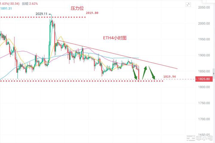 以太坊昨日高点1877附近,低点1850附近,以太联动大饼为主,走势要弱于大饼,在今日早间走了一波下跌,最低触及1816附近后开始反弹,并没有有效跌破1820支撑,目前仍处于下降趋势中。