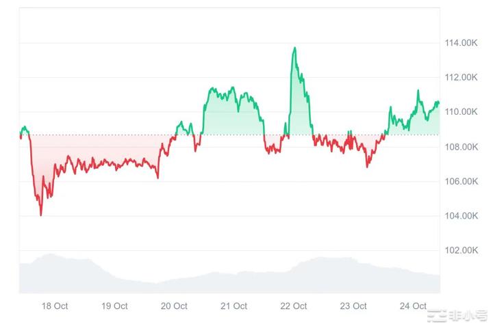 10月19日午后,比特币自 $107,000 一线开始温和上行,10月20日触及 $111,611 高点,日内振幅扩大,市场情绪明显改善。
