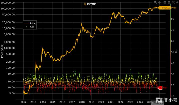 根据 Bitbo 数据,截至2025年10月24日,比特币 14 日 RSI 为 37 。该数值处于技术性“超卖”临界区(一般 RSI<30 为超卖,RSI>70 为超买)。RSI 在中低位徘徊表明市场尚未恢复强势,但下行空间相对有限。短期或进入“技术性修复反弹”阶段,若 RSI 能进一步突破 45 上方,将有望确认短期底部结构。