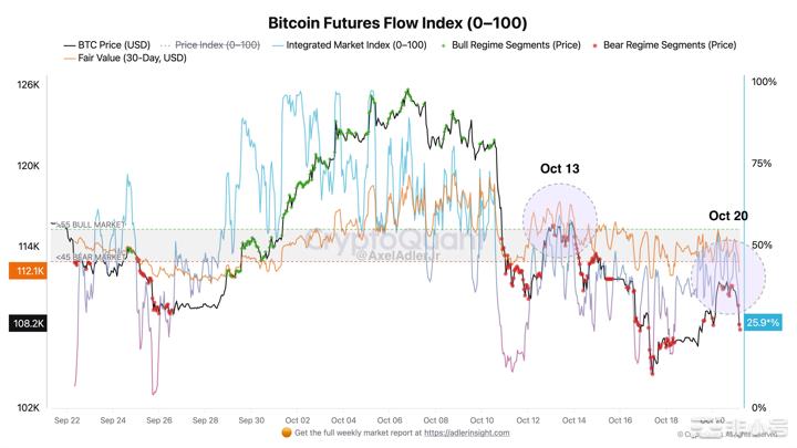CryptoQuant 分析师 Axel Adler Jr 指出,比特币期货流动指数低于 45,表明市场仍处于流动性不足的弱势区间。多头力量在尝试重夺主导地位时屡遭失败,目前价格仍低于 30 日公允价值,显示买方主动性减弱。与此同时,比特币未平仓合约(Open Interest)下降约 30%,意味着市场中过度杠杆的部分已被清除。