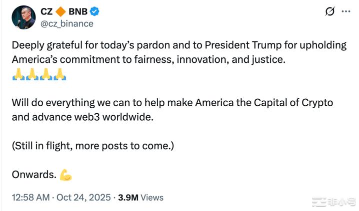 随后,币安创始人 CZ 在社交媒体平台发文表示,对今日获得的赦免以及特朗普总统维护美国对公平、创新和正义的承诺深表感谢。他将尽一切努力帮助美国成为加密货币之都,并推动 Web3 在全球的发展。