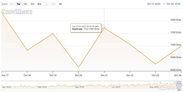 过去七天,比特币网络哈希率整体呈现波动,本周哈希率维持在 1014.88 EH/s 至 1172.14 EH/s 区间,处于相对高位。截至10月24日,全网算力达到 1.10 ZH/s,挖矿难度为 146.72 T。预计下一次难度调整将在10月29日 进行,预估上调约 6.70%,调整后难度约为 156.55 T。总体来看,全网算力维持高位,但波动加大,显示矿工在价格和成本压力下仍保持活跃挖矿。