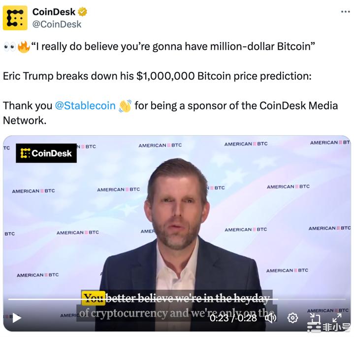 Eric Trump:比特币第四季度将迎来惊人表现,未来或涨至百万美元