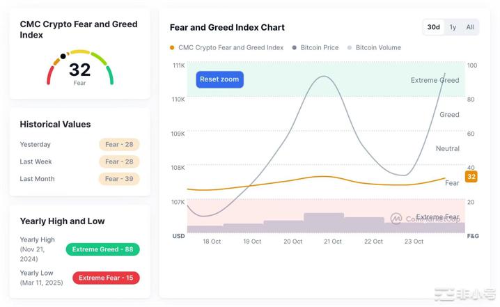 截至10月24日,恐惧与贪婪指数(Fear & Greed Index)报 32 点,位于“恐惧”(Fear)区间,显示市场整体情绪仍偏谨慎。投资者对比特币短期走势仍持观望态度,市场缺乏明显的风险偏好,情绪未出现明显回暖。