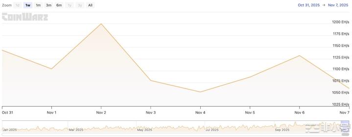 过去七天,比特币网络哈希率整体较为平稳,本周哈希率维持在1055.21 EH/s至1200.10 EH/s区间,处于相对高位。
