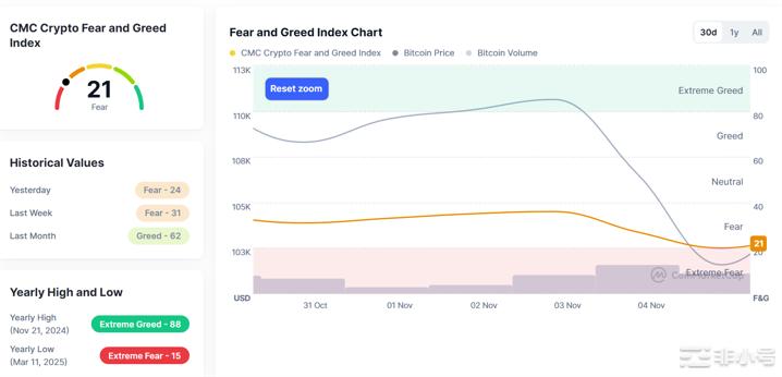 截至 11月7日,本周期末恐惧与贪婪指数(Fear & Greed Index)报21点,处于“极度恐惧”区间。图片数据显示指数持续走低。