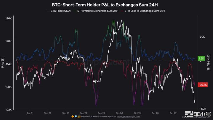 CryptoQuant 报告指出,短期持有者的亏损抛售正加剧市场下行压力。仅今日,就有约 30,300 枚比特币陷入亏损区间被转入交易所,显示出近期买家的“投降式”卖压明显上升。