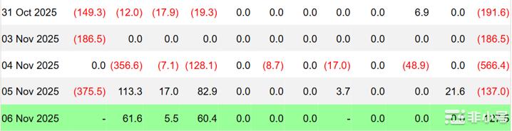 本周期内ETF资金大幅流出,尤其是4日及5日流出规模急增,反映出机构在市场不确定性增强期开始撤离或观望。11月6日虽有少量回流,但幅度远低于前两日流出规模,整体仍呈流出格局。