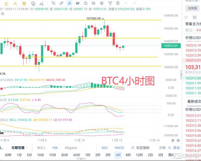 BTC截止发稿前高点103413附近,低点102687附近。在经过一轮拉升后最高触及107500,多头力度还是不够,并未有效突破上方承压,随后开始震荡下行,在昨晚跌破105000一线支撑。再次向下去冲击10万关口的概率还是比较大的。若不能成功跌破10万关口,则短期会走大区间震荡。
