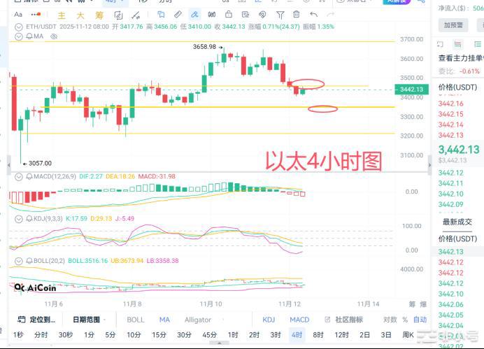 ETH截止发稿前高点3456附近,低点3456附近,以太近期走势跟着BTC动。在经过一波拉升后两次向上发力都均未有效突破。随后开始震荡下行,在昨晚跌破3460小支撑位,目前处于横盘中。
