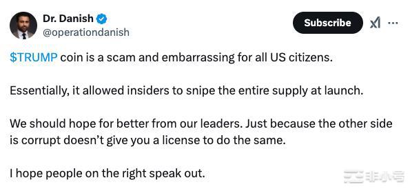 Bitcoin Magazine 的文章提出了非常直接的批评,其称「这不过是一个炒高抛售的自我牟利骗局,是一种不道德的行为,而参与其中的投资者(应该说是『粉丝』)愚蠢至极。该文的作者表示,其认为特朗普不会允许比特币与美元竞争,而这恰恰是比特币存在最初的意义,并暗示特朗普如果真正支持 Web3 则不应该将注意力放在将 Web3 视为「赌场」这件事上。