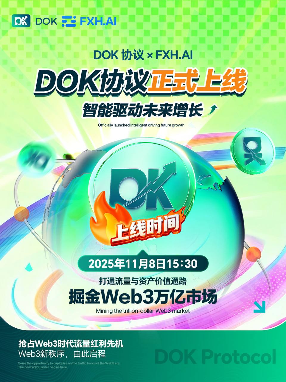 2025年11月8日15:00,DOK 协议正式上线主网,标志着 Web3 流量生态进入全新发展阶段。作为去中心化流量聚合与价值沉淀协议,DOK 致力于构建一个无需中心化控制、却能实现持续增长的流量引擎,将身份、数据、社交与资产深度融合,为项目方、社区和用户打造可持续、可激励的数字生态系统。